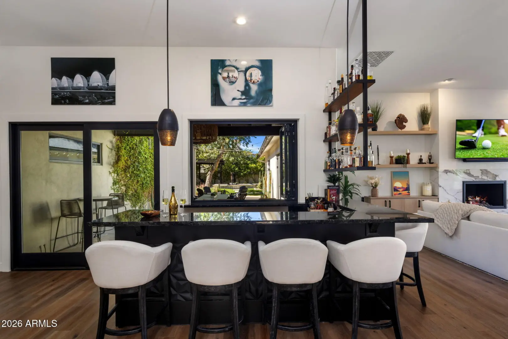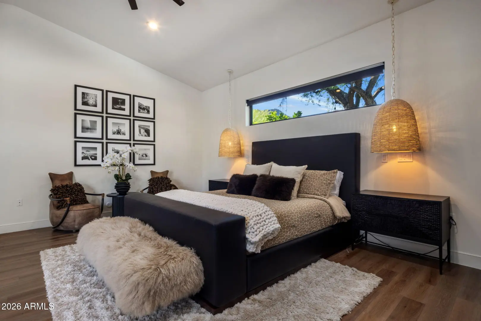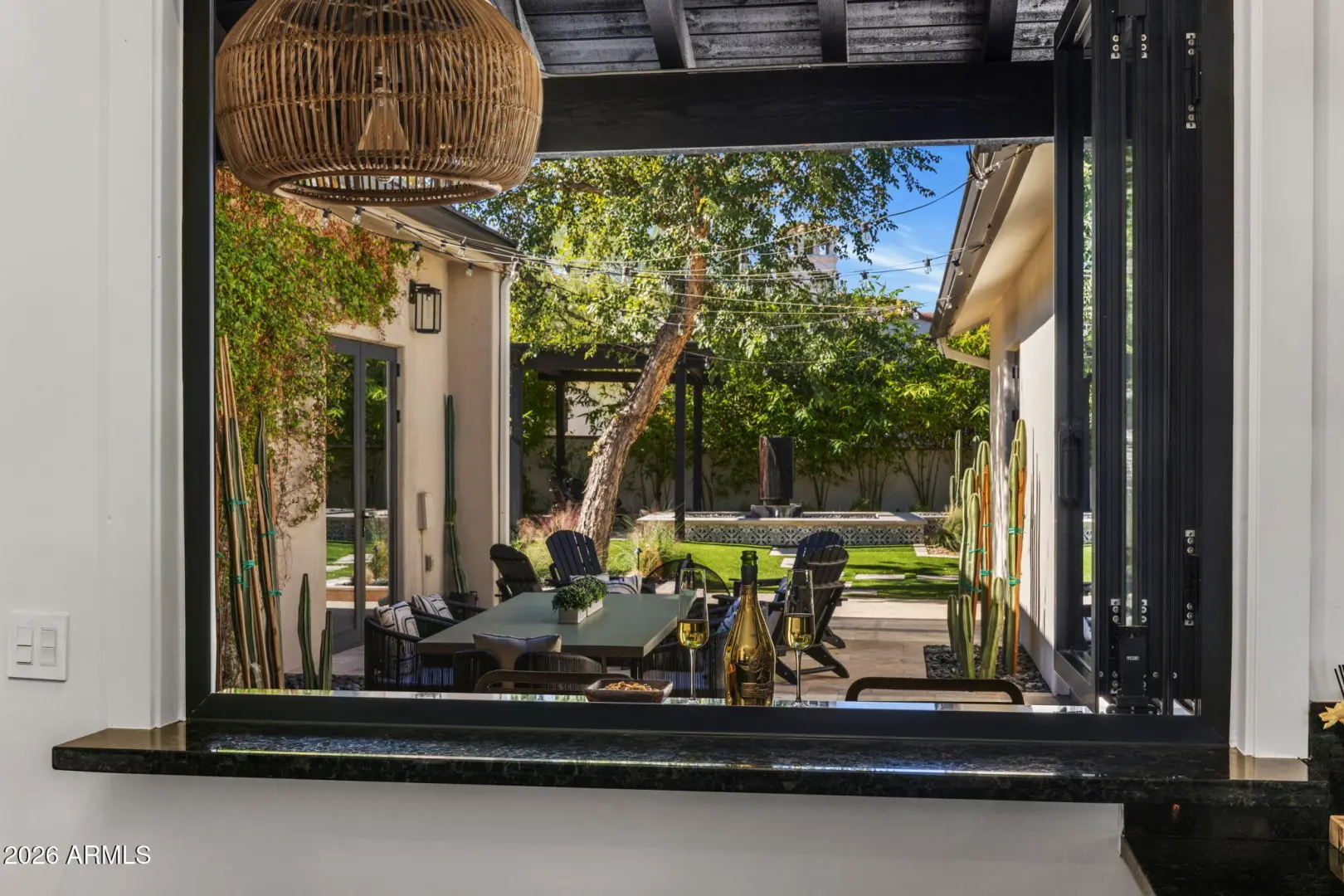 Stunning modern transitional estate on over an acre in one of Paradise Valley's most sought-after neighborhoods. Recently remodeled with exceptional attention to style and comfort, this 5-bedroom, 5.5-bath residence features soaring 12-foot ceilings, a dedicated large flex room, spacious den, and an open-concept kitchen and great room with a custom bar—ideal for entertaining. A dramatic wall of glass doors opens seamlessly to a resort-style pool and expansive outdoor living. Nestled among mature trees the grounds offer a private outdoor pavilion with fireplace, intimate dining patio and fountain, and Mummy Mountain views. Designed to feel like a true retreat, this remarkable property blends elegance, space, and tranquility in a coveted Paradsie Valley setting