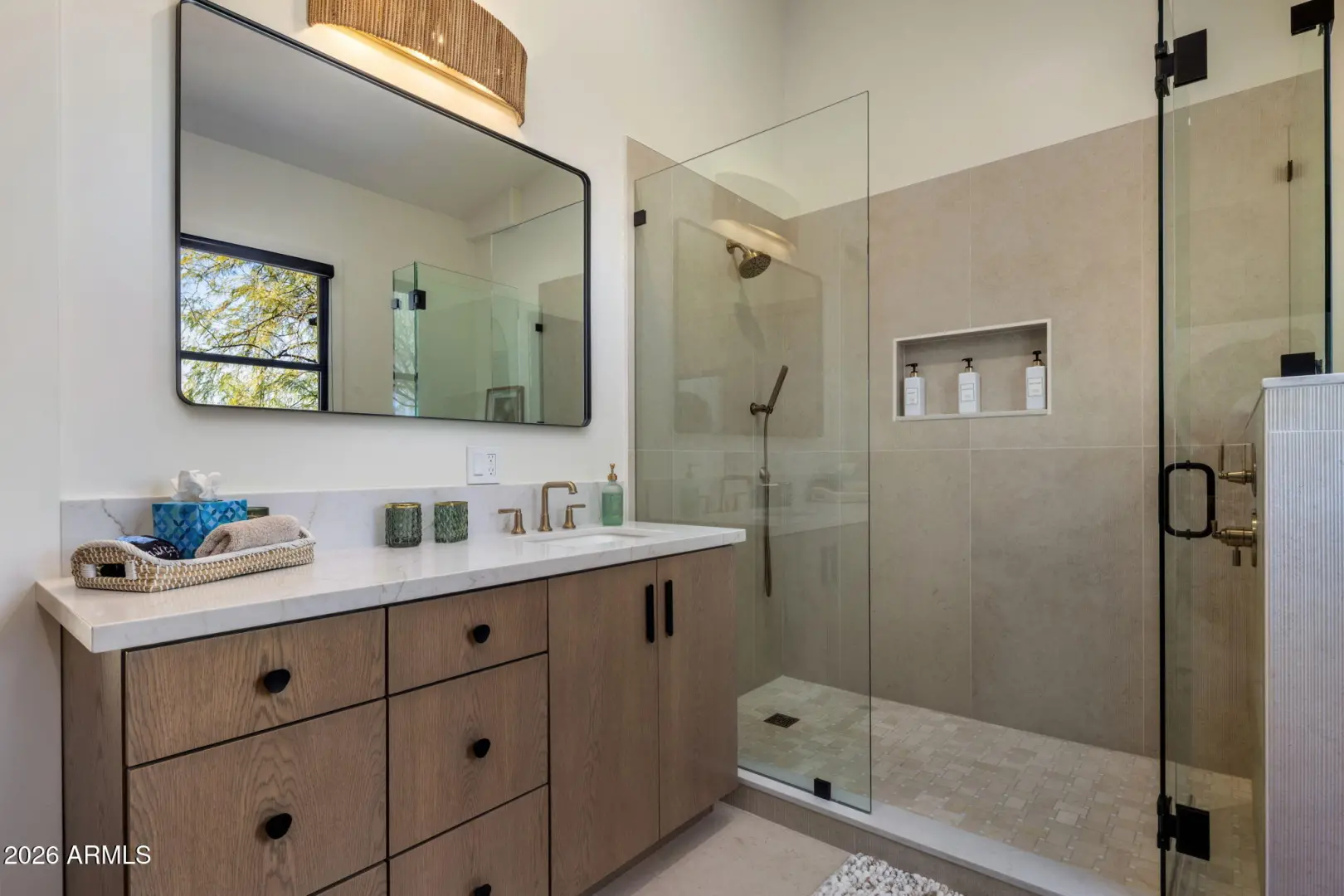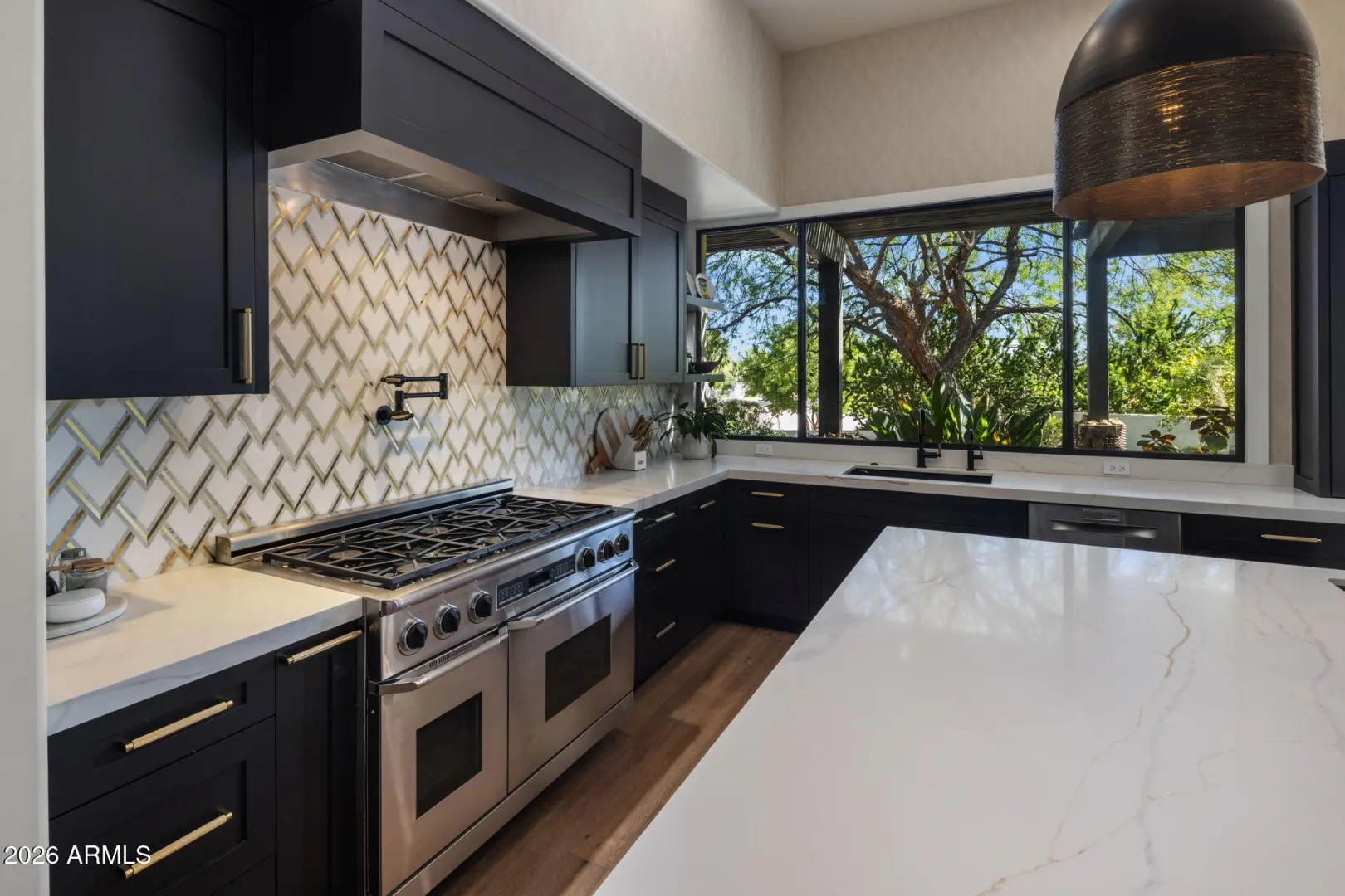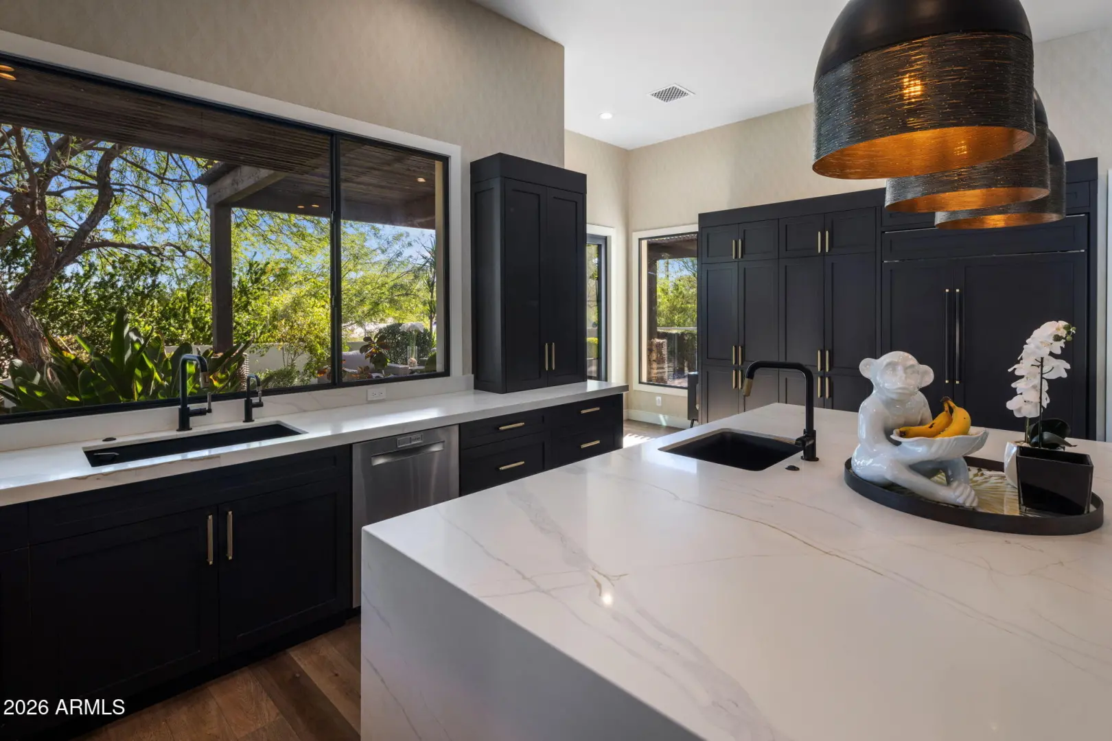 Stunning modern transitional estate on over an acre in one of Paradise Valley's most sought-after neighborhoods. Recently remodeled with exceptional attention to style and comfort, this 5-bedroom, 5.5-bath residence features soaring 12-foot ceilings, a dedicated large flex room, spacious den, and an open-concept kitchen and great room with a custom bar—ideal for entertaining. A dramatic wall of glass doors opens seamlessly to a resort-style pool and expansive outdoor living. Nestled among mature trees the grounds offer a private outdoor pavilion with fireplace, intimate dining patio and fountain, and Mummy Mountain views. Designed to feel like a true retreat, this remarkable property blends elegance, space, and tranquility in a coveted Paradsie Valley setting